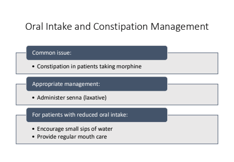 Oral Intake and Constipation Management%u2022 Constipation in patients taking morphineCommon issue:%u2022 Administer senna (laxative)Appropriate management:%u2022 Encourage small sips of water%u2022 Provide regular mouth careFor patients with reduced oral intake: