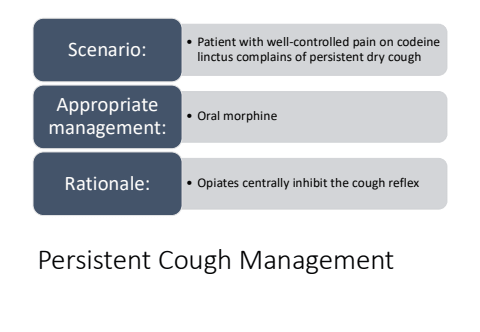 Persistent Cough Management%u2022 Patient with well-controlled pain on codeine linctus complains of persistent dry cough Scenario:%u2022 Oral morphine Appropriate management:Rationale: %u2022 Opiates centrally inhibit the cough reflex