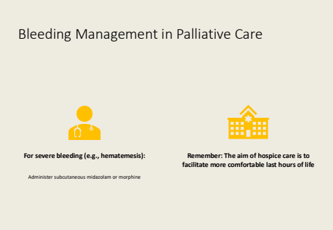 Bleeding Management in Palliative CareFor severe bleeding (e.g., hematemesis):Administer subcutaneous midazolam or morphineRemember: The aim of hospice care is to facilitate more comfortable last hours of life