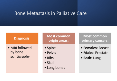 Bone Metastasis in Palliative CareDiagnosis:%u2022 MRI followed by bone scintigraphyMost common origin areas:%u2022 Spine%u2022 Pelvis%u2022 Ribs%u2022 Skull%u2022 Long bonesMost common primary cancers:%u2022 Females: Breast%u2022 Males: Prostate%u2022 Both: Lung