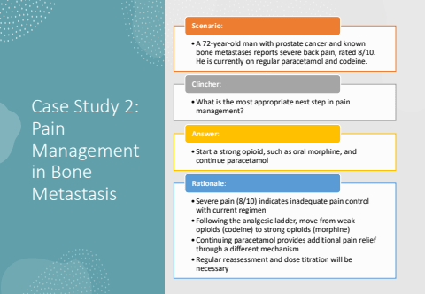 Case Study 2: Pain Management in Bone Metastasis%u2022A 72-year-old man with prostate cancer and known bone metastases reports severe back pain, rated 8/10. He is currently on regular paracetamol and codeine.Scenario:%u2022What is the most appropriate next step in pain management?Clincher:%u2022Start a strong opioid, such as oral morphine, and continue paracetamolAnswer:%u2022Severe pain (8/10) indicates inadequate pain control with current regimen%u2022Following the analgesic ladder, move from weak opioids (codeine) to strong opioids (morphine)%u2022Continuing paracetamol provides additional pain relief through a different mechanism%u2022Regular reassessment and dose titration will be necessaryRationale: