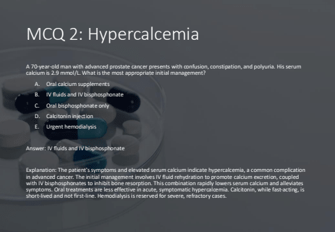 MCQ 2: HypercalcemiaA 70-year-old man with advanced prostate cancer presents with confusion, constipation, and polyuria. His serum calcium is 2.9 mmol/L. What is the most appropriate initial management?A. Oral calcium supplementsB. IV fluids and IV bisphosphonateC. Oral bisphosphonate onlyD. Calcitonin injectionE. Urgent hemodialysisAnswer: IV fluids and IV bisphosphonateExplanation: The patient's symptoms and elevated serum calcium indicate hypercalcemia, a common complication in advanced cancer. The initial management involves IV fluid rehydration to promote calcium excretion, coupled with IV bisphosphonates to inhibit bone resorption. This combination rapidly lowers serum calcium and alleviates symptoms. Oral treatments are less effective in acute, symptomatic hypercalcemia. Calcitonin, while fast-acting, is short-lived and not first-line. Hemodialysis is reserved for severe, refractory cases.