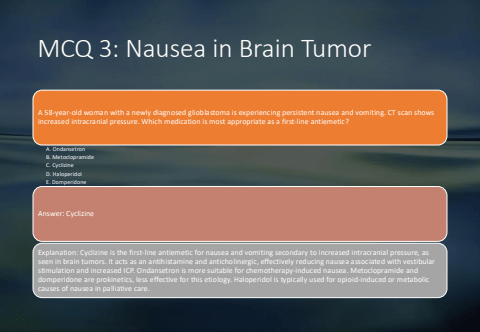 MCQ 3: Nausea in Brain TumorA 58-year-old woman with a newly diagnosed glioblastoma is experiencing persistent nausea and vomiting. CT scan shows increased intracranial pressure. Which medication is most appropriate as a first-line antiemetic?A. OndansetronB. MetoclopramideC. CyclizineD. HaloperidolE. DomperidoneAnswer: CyclizineExplanation: Cyclizine is the first-line antiemetic for nausea and vomiting secondary to increased intracranial pressure, as seen in brain tumors. It acts as an antihistamine and anticholinergic, effectively reducing nausea associated with vestibularstimulation and increased ICP. Ondansetron is more suitable for chemotherapy-induced nausea. Metoclopramide and domperidone are prokinetics, less effective for this etiology. Haloperidol is typically used for opioid-induced or metabolic causes of nausea in palliative care.