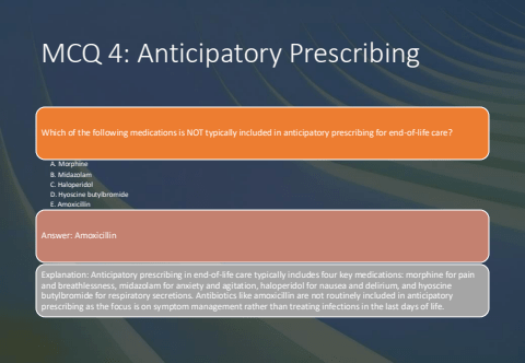 MCQ 4: Anticipatory PrescribingWhich of the following medications is NOT typically included in anticipatory prescribing for end-of-life care?A. MorphineB. MidazolamC. HaloperidolD. Hyoscine butylbromideE. AmoxicillinAnswer: AmoxicillinExplanation: Anticipatory prescribing in end-of-life care typically includes four key medications: morphine for pain and breathlessness, midazolam for anxiety and agitation, haloperidol for nausea and delirium, and hyoscine butylbromide for respiratory secretions. Antibiotics like amoxicillin are not routinely included in anticipatory prescribing as the focus is on symptom management rather than treating infections in the last days of life.