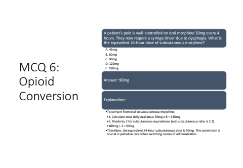MCQ 6: Opioid ConversionA patient's pain is well-controlled on oral morphine 30mg every 4 hours. They now require a syringe driver due to dysphagia. What is the equivalent 24-hour dose of subcutaneous morphine?A. 45mgB. 60mgC. 90mgD. 120mgE. 180mgAnswer: 90mgExplanation:%u2022To convert from oral to subcutaneous morphine:%u20221. Calculate total daily oral dose: 30mg x 6 = 180mg%u20222. Divide by 2 for subcutaneous equivalence (oral:subcutaneous ratio is 2:1)%u2022180mg %u00f7 2 = 90mg%u2022Therefore, the equivalent 24-hour subcutaneous dose is 90mg. This conversion is crucial in palliative care when switching routes of administration.