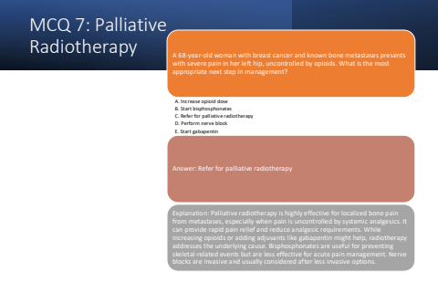 MCQ 7: Palliative Radiotherapy A 68-year-old woman with breast cancer and known bone metastases presents with severe pain in her left hip, uncontrolled by opioids. What is the most appropriate next step in management?A. Increase opioid doseB. Start bisphosphonatesC. Refer for palliative radiotherapyD. Perform nerve blockE. Start gabapentinAnswer: Refer for palliative radiotherapyExplanation: Palliative radiotherapy is highly effective for localized bone pain from metastases, especially when pain is uncontrolled by systemic analgesics. It can provide rapid pain relief and reduce analgesic requirements. While increasing opioids or adding adjuvants like gabapentin might help, radiotherapy addresses the underlying cause. Bisphosphonates are useful for preventing skeletal-related events but are less effective for acute pain management. Nerve blocks are invasive and usually considered after less invasive options.