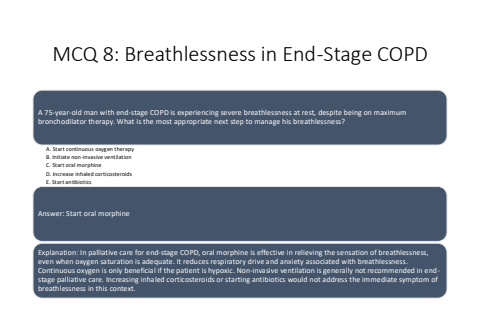 MCQ 8: Breathlessness in End-Stage COPDA 75-year-old man with end-stage COPD is experiencing severe breathlessness at rest, despite being on maximum bronchodilator therapy. What is the most appropriate next step to manage his breathlessness?A. Start continuous oxygen therapyB. Initiate non-invasive ventilationC. Start oral morphineD. Increase inhaled corticosteroidsE. Start antibioticsAnswer: Start oral morphineExplanation: In palliative care for end-stage COPD, oral morphine is effective in relieving the sensation of breathlessness, even when oxygen saturation is adequate. It reduces respiratory drive and anxiety associated with breathlessness. Continuous oxygen is only beneficial if the patient is hypoxic. Non-invasive ventilation is generally not recommended in endstage palliative care. Increasing inhaled corticosteroids or starting antibiotics would not address the immediate symptom of breathlessness in this context.