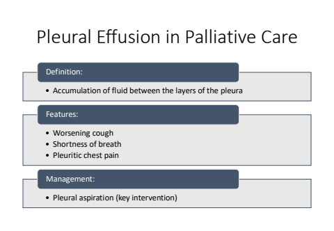 Pleural Effusion in Palliative Care%u2022 Accumulation of fluid between the layers of the pleuraDefinition:%u2022 Worsening cough%u2022 Shortness of breath%u2022 Pleuritic chest painFeatures:%u2022 Pleural aspiration (key intervention)Management: