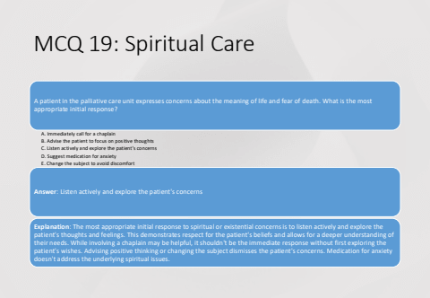 MCQ 19: Spiritual CareA patient in the palliative care unit expresses concerns about the meaning of life and fear of death. What is the most appropriate initial response?A. Immediately call for a chaplainB. Advise the patient to focus on positive thoughtsC. Listen actively and explore the patient's concernsD. Suggest medication for anxietyE. Change the subject to avoid discomfortAnswer: Listen actively and explore the patient's concernsExplanation: The most appropriate initial response to spiritual or existential concerns is to listen actively and explore the patient's thoughts and feelings. This demonstrates respect for the patient's beliefs and allows for a deeper understanding oftheir needs. While involving a chaplain may be helpful, it shouldn't be the immediate response without first exploring the patient's wishes. Advising positive thinking or changing the subject dismisses the patient's concerns. Medication for anxietydoesn't address the underlying spiritual issues.