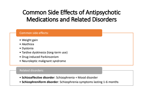 Common Side Effects of Antipsychotic Medications and Related Disorders%u2022 Weight gain%u2022 Akathisia%u2022 Dystonia%u2022 Tardive dyskinesia (long-term use)%u2022 Drug-induced Parkinsonism%u2022 Neuroleptic malignant syndromeCommon side effects:%u2022 Schizoaffective disorder: Schizophrenia + Mood disorder%u2022 Schizophreniform disorder: Schizophrenia symptoms lasting 1-6 monthsRelated disorders: