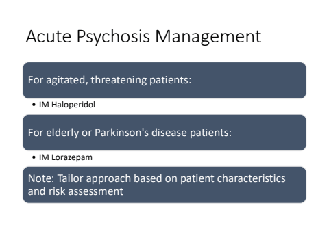 Acute Psychosis ManagementFor agitated, threatening patients:%u2022 IM HaloperidolFor elderly or Parkinson's disease patients:%u2022 IM LorazepamNote: Tailor approach based on patient characteristics and risk assessment