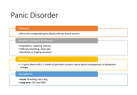 Panic Disorder%u2022Recurrent unexpected panic attacks with persistent concernDefinition:%u2022 Palpitations, sweating, tremors%u2022Difficulty breathing, chest pain%u2022Numbness or tingling sensationSymptoms (lasting 10-20 minutes):%u2022 > 1 panic attack with %u2265 1 month of persistent concern, worry about consequences, or behavioral changesDiagnosis:%u2022Acute: Breathing into a bag%u2022 Long-term: CBT and SSRIsManagement: