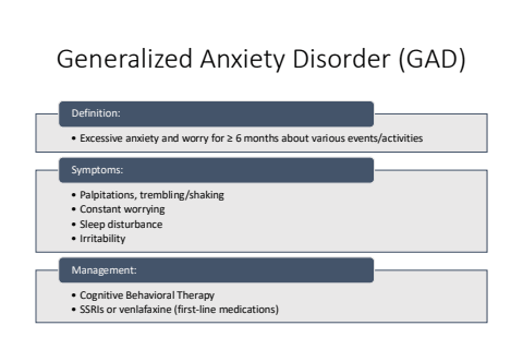 Generalized Anxiety Disorder (GAD)%u2022 Excessive anxiety and worry for %u2265 6 months about various events/activitiesDefinition:%u2022 Palpitations, trembling/shaking%u2022 Constant worrying%u2022 Sleep disturbance%u2022 IrritabilitySymptoms:%u2022 Cognitive Behavioral Therapy%u2022 SSRIs or venlafaxine (first-line medications)Management: