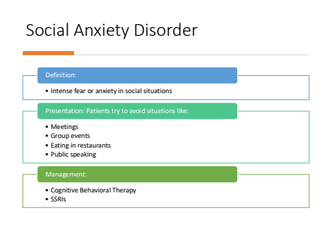 Social Anxiety Disorder%u2022 Intense fear or anxiety in social situationsDefinition:%u2022 Meetings%u2022 Group events%u2022 Eating in restaurants%u2022 Public speakingPresentation: Patients try to avoid situations like:%u2022 Cognitive Behavioral Therapy%u2022 SSRIsManagement: