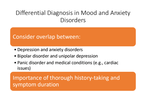 Differential Diagnosis in Mood and Anxiety DisordersConsider overlap between:%u2022 Depression and anxiety disorders%u2022 Bipolar disorder and unipolar depression%u2022 Panic disorder and medical conditions (e.g., cardiac issues)Importance of thorough history-taking and symptom duration