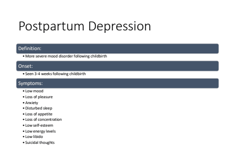 Postpartum DepressionDefinition:%u2022More severe mood disorder following childbirthOnset:%u2022 Seen 3-4 weeks following childbirthSymptoms:%u2022 Low mood%u2022 Loss of pleasure%u2022Anxiety%u2022Disturbed sleep%u2022 Loss of appetite%u2022 Loss of concentration%u2022 Low self-esteem%u2022 Low energy levels%u2022 Low libido%u2022 Suicidal thoughts