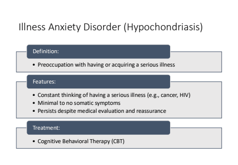 Illness Anxiety Disorder (Hypochondriasis)%u2022 Preoccupation with having or acquiring a serious illnessDefinition:%u2022 Constant thinking of having a serious illness (e.g., cancer, HIV)%u2022 Minimal to no somatic symptoms%u2022 Persists despite medical evaluation and reassuranceFeatures:%u2022 Cognitive Behavioral Therapy (CBT)Treatment: