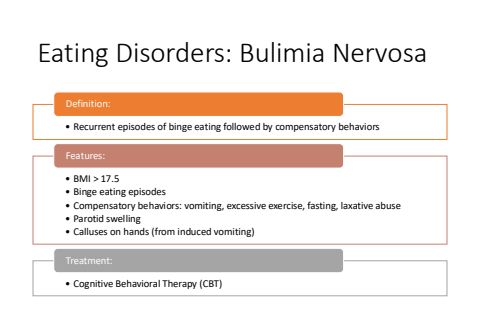 Eating Disorders: Bulimia Nervosa%u2022 Recurrent episodes of binge eating followed by compensatory behaviorsDefinition:%u2022 BMI > 17.5%u2022 Binge eating episodes%u2022 Compensatory behaviors: vomiting, excessive exercise, fasting, laxative abuse%u2022 Parotid swelling%u2022 Calluses on hands (from induced vomiting)Features:%u2022 Cognitive Behavioral Therapy (CBT)Treatment: