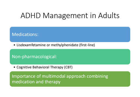 ADHD Management in AdultsMedications:%u2022 Lisdexamfetamine or methylphenidate (first-line)Non-pharmacological:%u2022 Cognitive Behavioral Therapy (CBT)Importance of multimodal approach combining medication and therapy