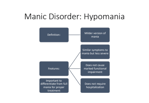 Manic Disorder: HypomaniaDefinition: Milder version of maniaFeatures:Similar symptoms to mania but less severeDoes not cause marked functional impairmentDoes not require hospitalizationImportant to differentiate from full mania for proper treatment