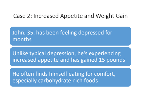 Case 2: Increased Appetite and Weight GainJohn, 35, has been feeling depressed for monthsUnlike typical depression, he's experiencing increased appetite and has gained 15 poundsHe often finds himself eating for comfort, especially carbohydrate-rich foods