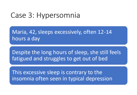 Case 3: HypersomniaMaria, 42, sleeps excessively, often 12-14 hours a dayDespite the long hours of sleep, she still feels fatigued and struggles to get out of bedThis excessive sleep is contrary to the insomnia often seen in typical depression