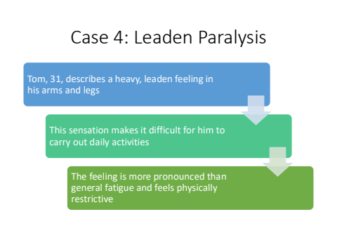 Case 4: Leaden ParalysisTom, 31, describes a heavy, leaden feeling in his arms and legsThis sensation makes it difficult for him to carry out daily activitiesThe feeling is more pronounced than general fatigue and feels physically restrictive