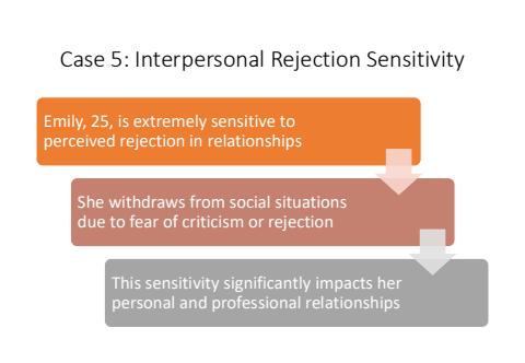 Case 5: Interpersonal Rejection SensitivityEmily, 25, is extremely sensitive to perceived rejection in relationshipsShe withdraws from social situations due to fear of criticism or rejectionThis sensitivity significantly impacts her personal and professional relationships