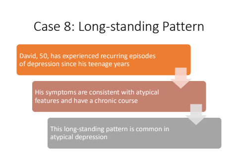Case 8: Long-standing PatternDavid, 50, has experienced recurring episodes of depression since his teenage yearsHis symptoms are consistent with atypical features and have a chronic courseThis long-standing pattern is common in atypical depression