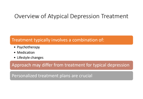 Overview of Atypical Depression TreatmentTreatment typically involves a combination of:%u2022 Psychotherapy%u2022 Medication%u2022 Lifestyle changesApproach may differ from treatment for typical depressionPersonalized treatment plans are crucial