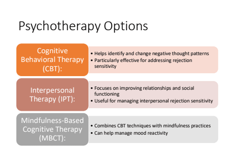 Psychotherapy Options%u2022 Helps identify and change negative thought patterns%u2022 Particularly effective for addressing rejection sensitivityCognitive Behavioral Therapy (CBT):%u2022 Focuses on improving relationships and social functioning%u2022 Useful for managing interpersonal rejection sensitivityInterpersonal Therapy (IPT):%u2022 Combines CBT techniques with mindfulness practices%u2022 Can help manage mood reactivityMindfulness-Based Cognitive Therapy (MBCT):