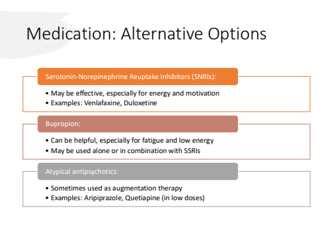 Medication: Alternative Options%u2022 May be effective, especially for energy and motivation%u2022 Examples: Venlafaxine, DuloxetineSerotonin-Norepinephrine Reuptake Inhibitors (SNRIs):%u2022 Can be helpful, especially for fatigue and low energy%u2022 May be used alone or in combination with SSRIsBupropion:%u2022 Sometimes used as augmentation therapy%u2022 Examples: Aripiprazole, Quetiapine (in low doses)Atypical antipsychotics: