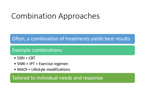 Combination ApproachesOften, a combination of treatments yields best resultsExample combinations:%u2022 SSRI + CBT%u2022 SNRI + IPT + Exercise regimen%u2022 MAOI + Lifestyle modificationsTailored to individual needs and response