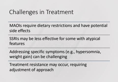 Challenges in TreatmentMAOIs require dietary restrictions and have potential side effectsSSRIs may be less effective for some with atypical featuresAddressing specific symptoms (e.g., hypersomnia, weight gain) can be challengingTreatment resistance may occur, requiring adjustment of approach