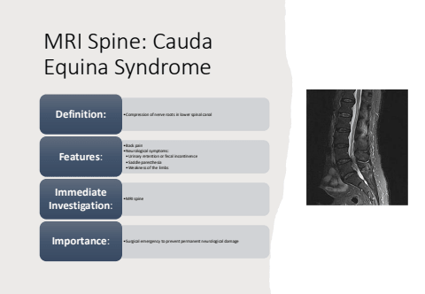 MRI Spine: Cauda Equina SyndromeDefinition: %u2022Compression of nerve roots in lower spinal canal%u2022Back pain%u2022Neurological symptoms:%u2022Urinary retention or fecal incontinence%u2022Saddle paresthesia%u2022Weakness of the limbsFeatures:%u2022MRI spineImmediate Investigation:%u2022Surgical emergency to prevent permanent neurological damage Importance: