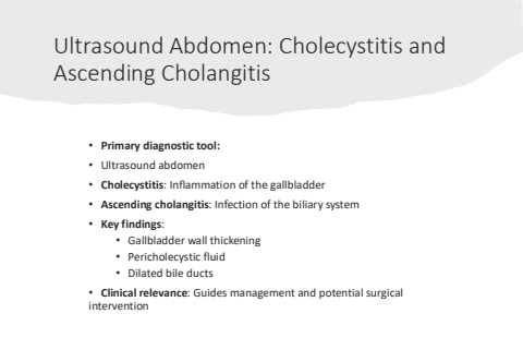 Ultrasound Abdomen: Cholecystitis and Ascending Cholangitis%u2022 Primary diagnostic tool:%u2022 Ultrasound abdomen%u2022 Cholecystitis: Inflammation of the gallbladder%u2022 Ascending cholangitis: Infection of the biliary system%u2022 Key findings:%u2022 Gallbladder wall thickening%u2022 Pericholecystic fluid%u2022 Dilated bile ducts%u2022 Clinical relevance: Guides management and potential surgical intervention