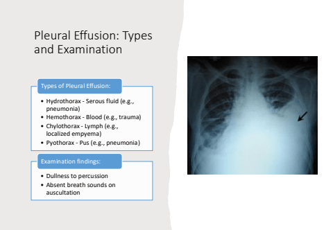 Pleural Effusion: Types and Examination%u2022 Hydrothorax - Serous fluid (e.g., pneumonia)%u2022 Hemothorax - Blood (e.g., trauma)%u2022 Chylothorax - Lymph (e.g., localized empyema)%u2022 Pyothorax - Pus (e.g., pneumonia)Types of Pleural Effusion:%u2022 Dullness to percussion%u2022 Absent breath sounds on auscultationExamination findings: