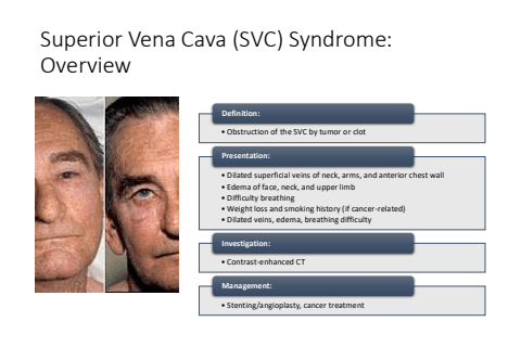 Superior Vena Cava (SVC) Syndrome: Overview%u2022 Obstruction of the SVC by tumor or clotDefinition:%u2022 Dilated superficial veins of neck, arms, and anterior chest wall%u2022 Edema of face, neck, and upper limb%u2022 Difficulty breathing%u2022 Weight loss and smoking history (if cancer-related)%u2022 Dilated veins, edema, breathing difficultyPresentation:%u2022 Contrast-enhanced CTInvestigation:%u2022 Stenting/angioplasty, cancer treatmentManagement: