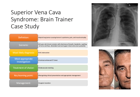 Superior Vena Cava Syndrome: Brain Trainer Case StudyDefinition: %u2022Apical lung tumor causing Horner's syndrome, pain, and muscle atrophy%u202245-year-old chronic smoker with shortness of breath, headache, swelling of arms and face, distended neck and upper chest veins (non-pulsatile) Scenario:Most likely diagnosis: %u2022SVC obstruction%u2022Contrast-enhanced CT chestMost appropriate investigation:Treatment of choice: %u2022Endovascular stentingKey learning point: %u2022Recognizing clinical presentation and appropriate managementManagement: %u2022Surgical resection