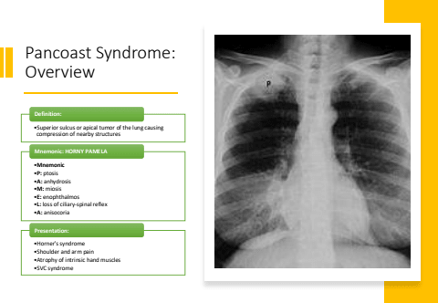 Pancoast Syndrome: Overview%u2022Superior sulcus or apical tumor of the lung causing compression of nearby structuresDefinition:%u2022Mnemonic%u2022P: ptosis%u2022A: anhydrosis%u2022M: miosis%u2022E: enophthalmos%u2022L: loss of ciliary-spinal reflex%u2022A: anisocoriaMnemonic: HORNY PAMELA%u2022Horner's syndrome%u2022Shoulder and arm pain%u2022Atrophy of intrinsic hand muscles%u2022SVC syndromePresentation: