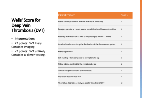 Wells' Score for Deep Vein Thrombosis (DVT)%u2022 Interpretation:%u2022 %u22652 points: DVT likely. Consider imaging.%u2022 <2 points: DVT unlikely. Consider D-dimer testing.Clinical Feature PointsActive cancer (treatment within 6 months or palliative) 1Paralysis, paresis, or recent plaster immobilization of lower extremities 1Recently bedridden for %u22653 days or major surgery within 12 weeks 1Localized tenderness along the distribution of the deep venous system 1Entire leg swollen 1Calf swelling >3 cm compared to asymptomatic leg 1Pitting edema confined to the symptomatic leg 1Collateral superficial veins (non-varicose) 1Previously documented DVT 1Alternative diagnosis as likely or greater than that of DVT -2
