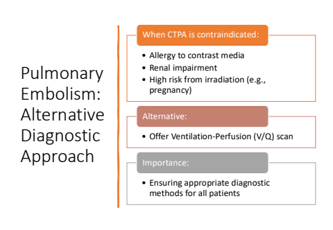 Pulmonary Embolism: Alternative Diagnostic Approach%u2022 Allergy to contrast media%u2022 Renal impairment%u2022 High risk from irradiation (e.g., pregnancy)When CTPA is contraindicated:%u2022 Offer Ventilation-Perfusion (V/Q) scanAlternative:%u2022 Ensuring appropriate diagnostic methods for all patientsImportance: