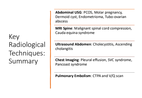 Key Radiological Techniques: SummaryAbdominal USG: PCOS, Molar pregnancy, Dermoid cyst, Endometrioma, Tubo-ovarian abscessMRI Spine: Malignant spinal cord compression, Cauda equina syndromeUltrasound Abdomen: Cholecystitis, Ascending cholangitisChest Imaging: Pleural effusion, SVC syndrome, Pancoast syndromePulmonary Embolism: CTPA and V/Q scan