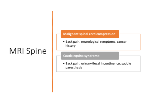 MRI Spine%u2022 Back pain, neurological symptoms, cancer historyMalignant spinal cord compression:%u2022 Back pain, urinary/fecal incontinence, saddle paresthesiaCauda equina syndrome: