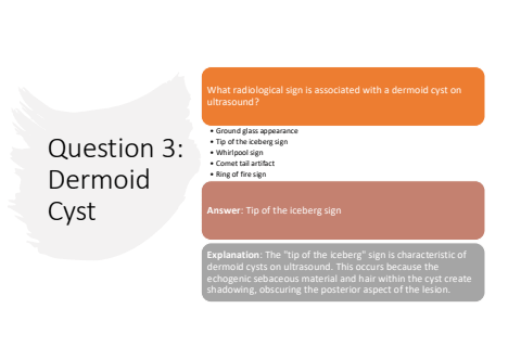 Question 3: Dermoid CystWhat radiological sign is associated with a dermoid cyst on ultrasound?%u2022 Ground glass appearance%u2022 Tip of the iceberg sign%u2022 Whirlpool sign%u2022 Comet tail artifact%u2022 Ring of fire signAnswer: Tip of the iceberg signExplanation: The \dermoid cysts on ultrasound. This occurs because the echogenic sebaceous material and hair within the cyst create shadowing, obscuring the posterior aspect of the lesion.