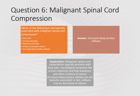 Question 6: Malignant Spinal Cord CompressionWhich of the following is not typically associated with malignant spinal cord compression?%u2022 Back pain%u2022 Urinary retention%u2022 Weakness of limbs%u2022 History of prostate cancer%u2022 Increased deep tendon reflexesAnswer: Increased deep tendon reflexesExplanation: Malignant spinal cord compression typically presents with back pain, neurological symptoms like urinary retention and limb weakness, and often a history of cancer. Increased deep tendon reflexes are not typically associated; in fact, reflexes may be decreased or absent.