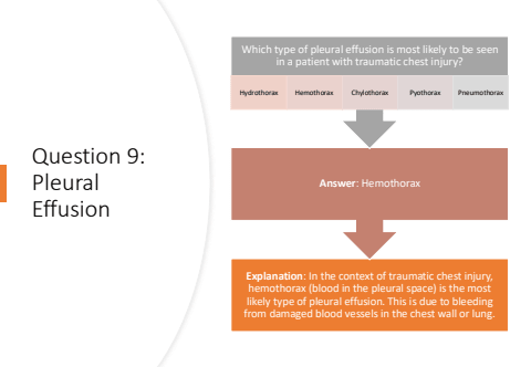 Question 9: Pleural EffusionExplanation: In the context of traumatic chest injury, hemothorax (blood in the pleural space) is the most likely type of pleural effusion. This is due to bleeding from damaged blood vessels in the chest wall or lung.Answer: HemothoraxWhich type of pleural effusion is most likely to be seen in a patient with traumatic chest injury?Hydrothorax Hemothorax Chylothorax Pyothorax Pneumothorax