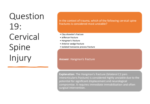 Question 19: Cervical Spine InjuryIn the context of trauma, which of the following cervical spine fractures is considered most unstable?%u2022 Clay-shoveler's fracture%u2022 Jefferson fracture%u2022 Hangman's fracture%u2022 Anterior wedge fracture%u2022 Isolated transverse process fractureAnswer: Hangman's fractureExplanation: The Hangman's fracture (bilateral C2 pars interarticularis fracture) is considered highly unstable due to the potential for significant displacement and neurological compromise. It requires immediate immobilization and often surgical intervention.