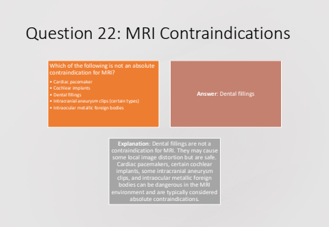 Question 22: MRI ContraindicationsWhich of the following is not an absolute contraindication for MRI?%u2022 Cardiac pacemaker%u2022 Cochlear implants%u2022 Dental fillings%u2022 Intracranial aneurysm clips (certain types)%u2022 Intraocular metallic foreign bodiesAnswer: Dental fillingsExplanation: Dental fillings are not a contraindication for MRI. They may cause some local image distortion but are safe. Cardiac pacemakers, certain cochlear implants, some intracranial aneurysm clips, and intraocular metallic foreign bodies can be dangerous in the MRI environment and are typically considered absolute contraindications.