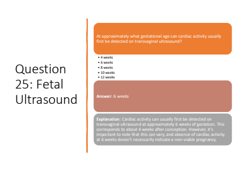 Question 25: Fetal UltrasoundAt approximately what gestational age can cardiac activity usually first be detected on transvaginal ultrasound?%u2022 4 weeks%u2022 6 weeks%u2022 8 weeks%u2022 10 weeks%u2022 12 weeksAnswer: 6 weeksExplanation: Cardiac activity can usually first be detected on transvaginal ultrasound at approximately 6 weeks of gestation. This corresponds to about 4 weeks after conception. However, it's important to note that this can vary, and absence of cardiac activity at 6 weeks doesn't necessarily indicate a non-viable pregnancy.